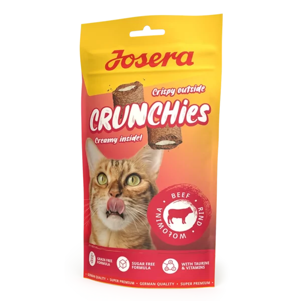تشویقی گربه به صورت کرانچی مغزدار با طعم بیف از برند جوسرا میان وعده ای کم کالری و فاقد غلات است که به دفع موهای بلعیده شده کمک می کند.