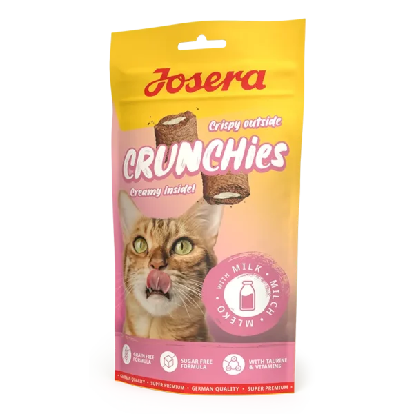 کرانچی های ترد با فیلینگ کرمی-خامه ای و طعم شیر برای گربه های بالغ همه نژادها تولید شده اند. این اسنک های کم کالری و بدون غلات یک میان وعده عالی برای هر روز هستند. در ترکیب این خوراک از ویتامین های ارزشمند و تائورین برای تامین نیاز های بدن گربه استفاده شده است. تشویقی کرانچی با طعم شیر جوسرا آنتی هیربال بوده و در دفع آسان گلوله های مویی موثر می باشد. این میان وعده فاقد قندهای افزوده، سویا، رنگ، نگهدارنده و طعم دهنده های مصنوعی است.